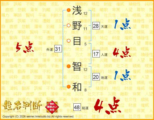 浅(12画)野(11画)目(5画) 智(12画)和(8画)