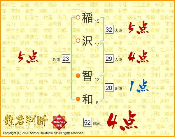 生活面を象徴する運勢です。外部から受ける影響力を表し、結婚運、家庭運や職場、環境への順応性を表します。総運から人運を引いた画数。姓や名が1文字の場合を除く。