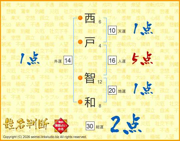 生活面を象徴する運勢です。外部から受ける影響力を表し、結婚運、家庭運や職場、環境への順応性を表します。総運から人運を引いた画数。姓や名が1文字の場合を除く。