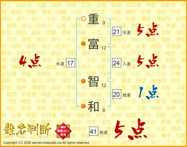 生活面を象徴する運勢です。外部から受ける影響力を表し、結婚運、家庭運や職場、環境への順応性を表します。総運から人運を引いた画数。姓や名が1文字の場合を除く。