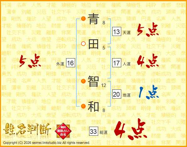 青(8画)田(5画) 智(12画)和(8画)