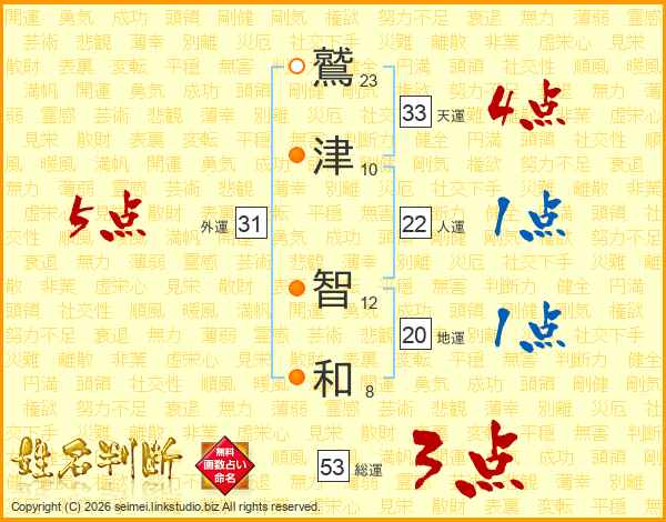 鷲(23画)津(10画) 智(12画)和(8画)
