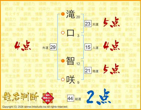 滝(20画)口(3画) 智(12画)咲(9画)