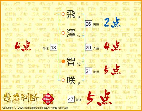 飛(9画)澤(17画) 智(12画)咲(9画)