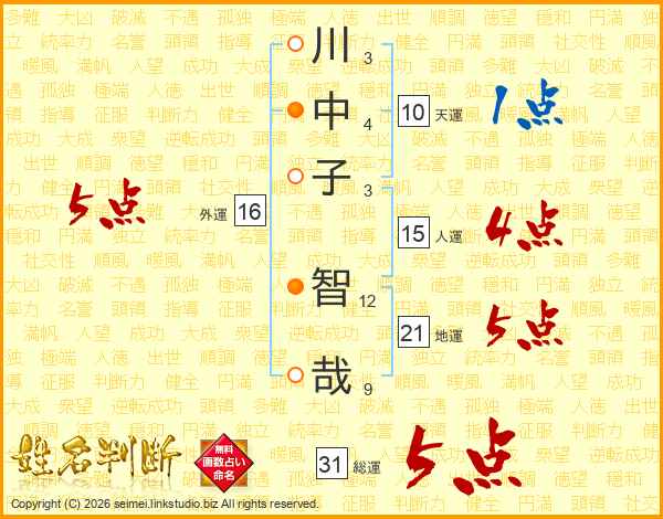 川中子智哉さんの地運は21画の5点!