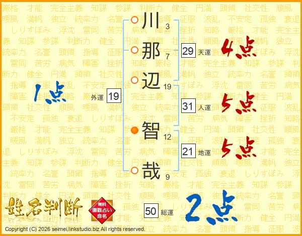 川(3画)那(7画)辺(19画) 智(12画)哉(9画)