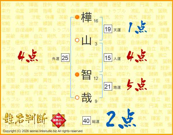 樺(16画)山(3画) 智(12画)哉(9画)