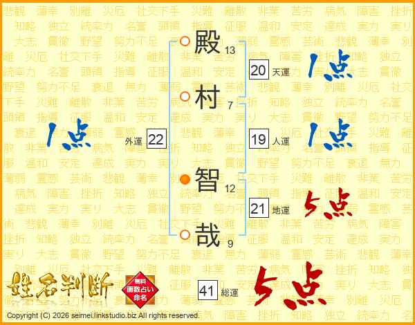 殿(13画)村(7画) 智(12画)哉(9画)