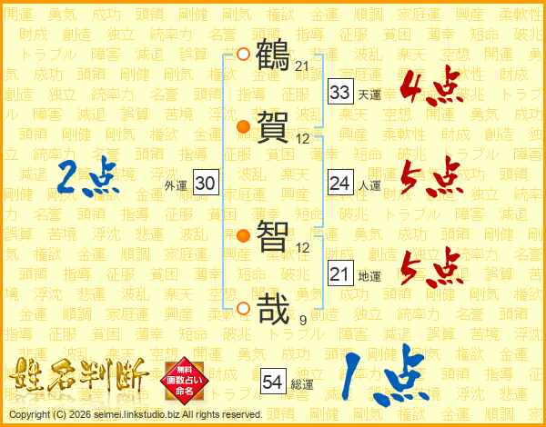鶴(21画)賀(12画) 智(12画)哉(9画)