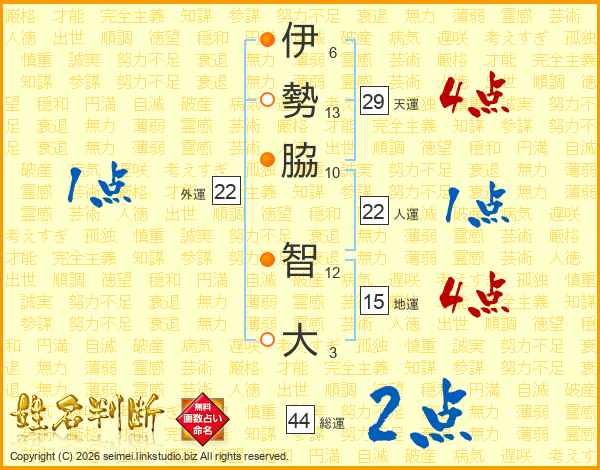 伊(6画)勢(13画)脇(10画) 智(12画)大(3画)