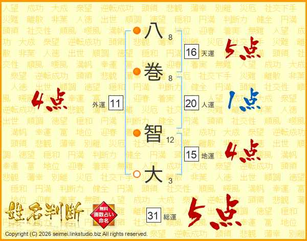 あなたの人生を表す1番重要な運勢です。生涯を通じて影響する総合運となり、主に50歳以降の晩年期に影響を及ぼします。苗字と名前の合計画数。