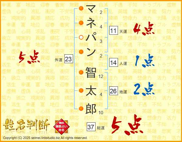 マ(2画)ネ(4画)パ(3画)ン(2画) 智(12画)太(4画)郎(10画)