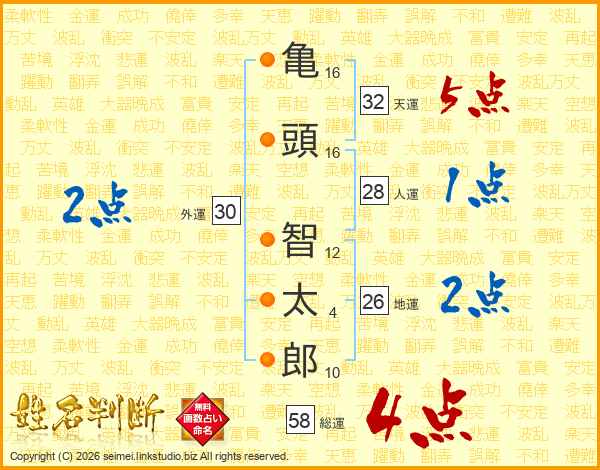 亀(16画)頭(16画) 智(12画)太(4画)郎(10画)