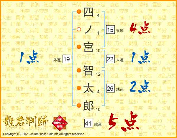 四(4画)ノ(1画)宮(10画) 智(12画)太(4画)郎(10画)