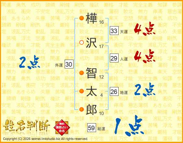 樺沢智太郎さんの天運は33画の4点!