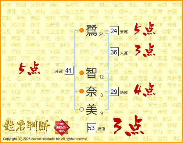 鷺(24画) 智(12画)奈(8画)美(9画)