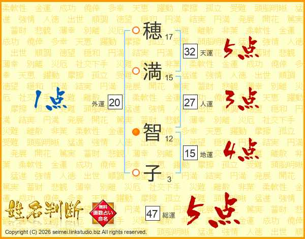 穂(17画)満(15画) 智(12画)子(3画)