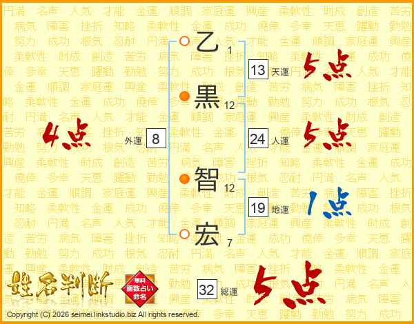 乙(1画)黒(12画) 智(12画)宏(7画)
