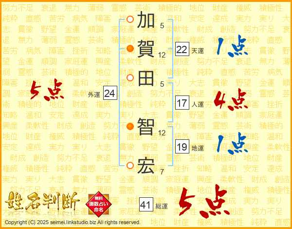 加(5画)賀(12画)田(5画) 智(12画)宏(7画)