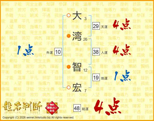 生活面を象徴する運勢です。外部から受ける影響力を表し、結婚運、家庭運や職場、環境への順応性を表します。総運から人運を引いた画数。姓や名が1文字の場合を除く。