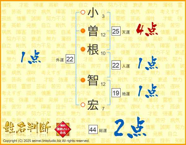 小(3画)曽(12画)根(10画) 智(12画)宏(7画)