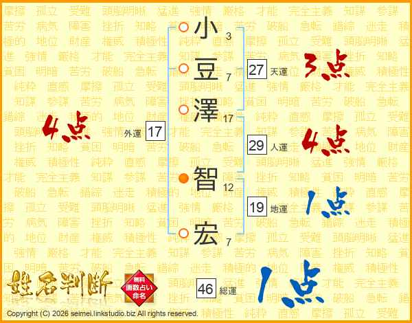 小(3画)豆(7画)澤(17画) 智(12画)宏(7画)