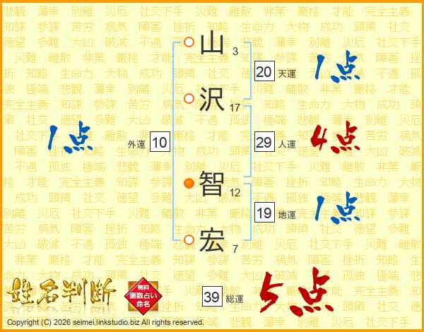 あなたの人生を表す1番重要な運勢です。生涯を通じて影響する総合運となり、主に50歳以降の晩年期に影響を及ぼします。苗字と名前の合計画数。