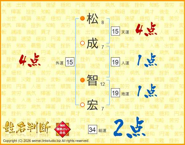 あなたの人生を表す1番重要な運勢です。生涯を通じて影響する総合運となり、主に50歳以降の晩年期に影響を及ぼします。苗字と名前の合計画数。