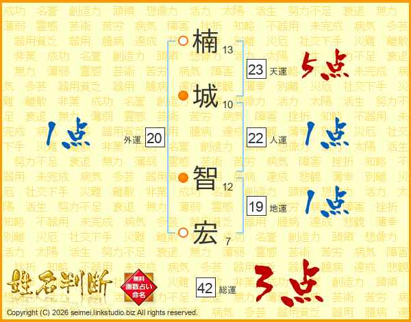 楠(13画)城(10画) 智(12画)宏(7画)