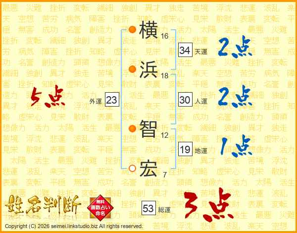 生活面を象徴する運勢です。外部から受ける影響力を表し、結婚運、家庭運や職場、環境への順応性を表します。総運から人運を引いた画数。姓や名が1文字の場合を除く。