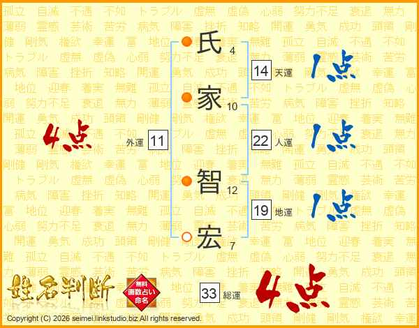 氏(4画)家(10画) 智(12画)宏(7画)