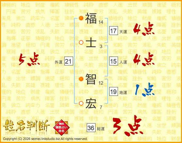 福(14画)士(3画) 智(12画)宏(7画)