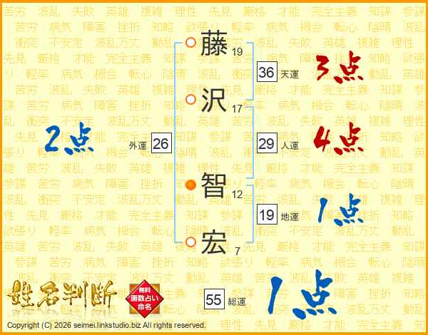 藤(19画)沢(17画) 智(12画)宏(7画)