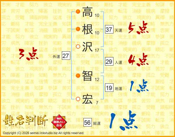 高(10画)根(10画)沢(17画) 智(12画)宏(7画)