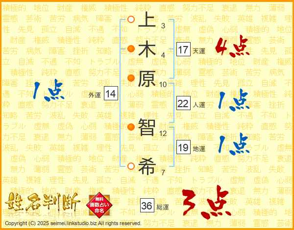 上(3画)木(4画)原(10画) 智(12画)希(7画)