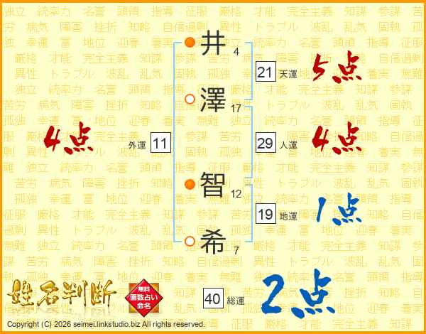 生活面を象徴する運勢です。外部から受ける影響力を表し、結婚運、家庭運や職場、環境への順応性を表します。総運から人運を引いた画数。姓や名が1文字の場合を除く。