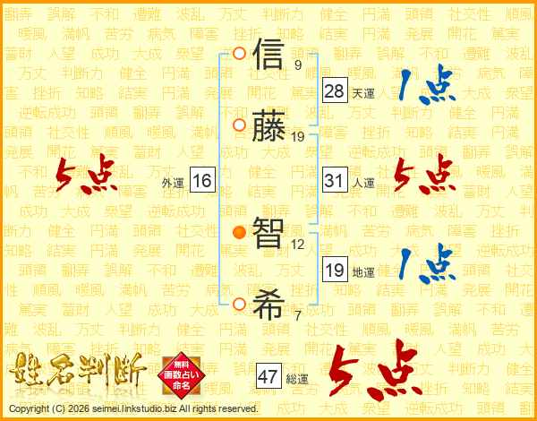 信(9画)藤(19画) 智(12画)希(7画)