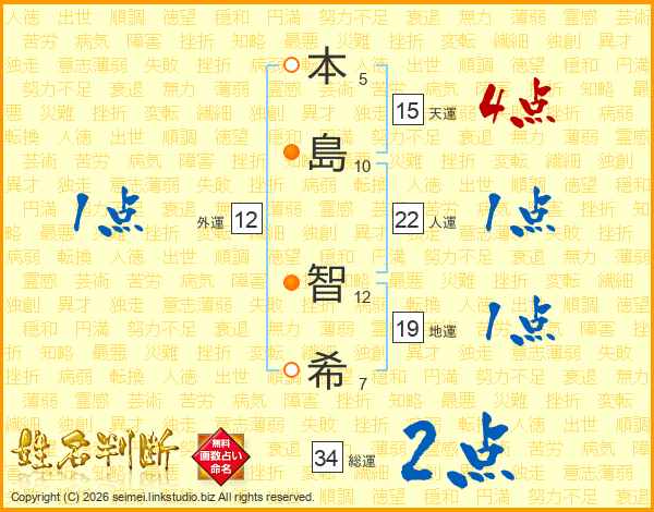 本(5画)島(10画) 智(12画)希(7画)