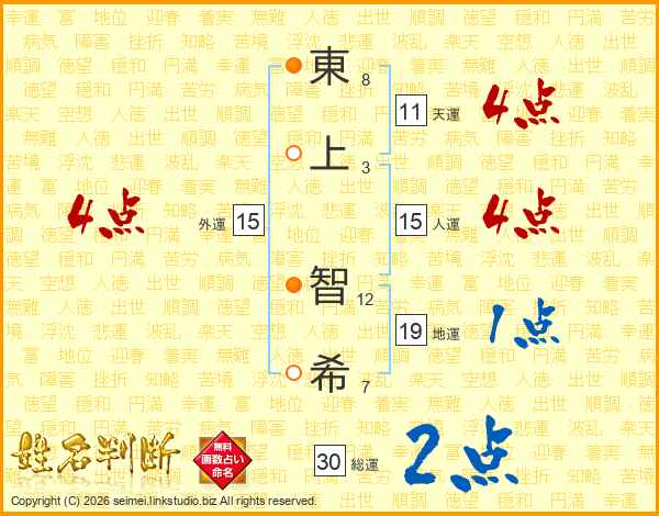 東(8画)上(3画) 智(12画)希(7画)