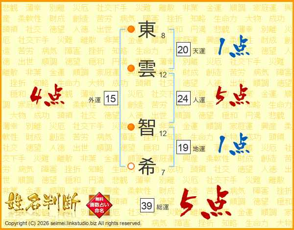 東(8画)雲(12画) 智(12画)希(7画)