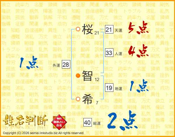 桜(21画) 智(12画)希(7画)