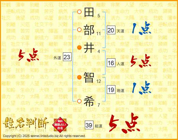 田(5画)部(11画)井(4画) 智(12画)希(7画)