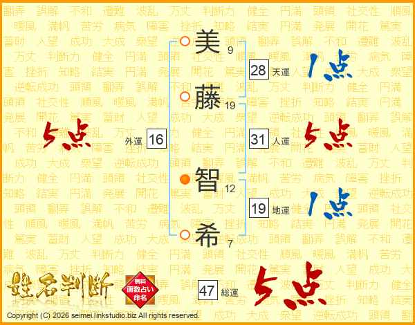 画数の奇数(○陽)と偶数(●陰)の配列で吉凶を占います。どちらかにかたよる名前は大凶名で避ける必要があります。画数の奇数偶数。