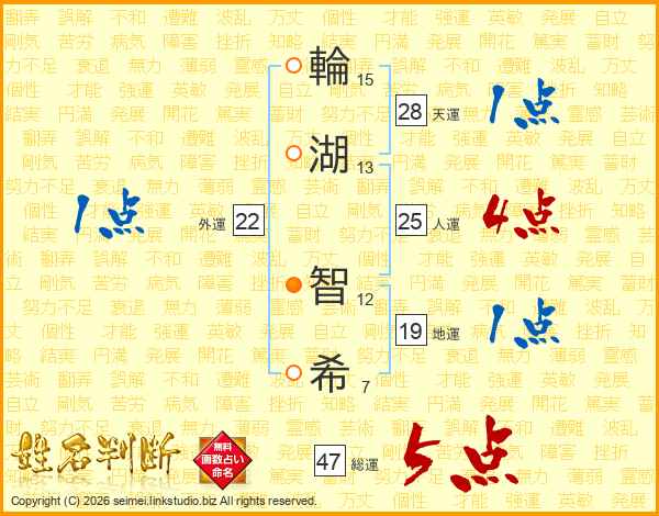 輪(15画)湖(13画) 智(12画)希(7画)