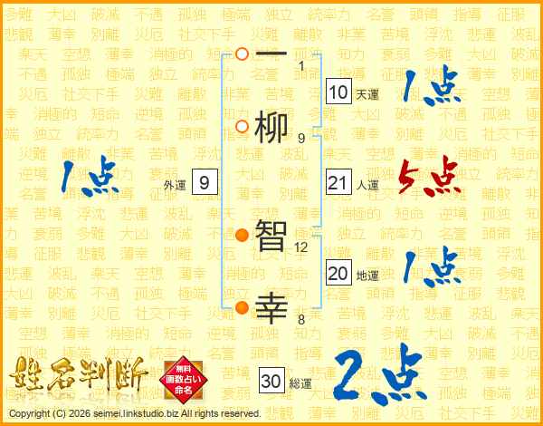 生活面を象徴する運勢です。外部から受ける影響力を表し、結婚運、家庭運や職場、環境への順応性を表します。総運から人運を引いた画数。姓や名が1文字の場合を除く。