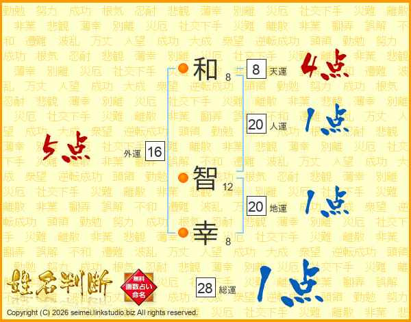 生活面を象徴する運勢です。外部から受ける影響力を表し、結婚運、家庭運や職場、環境への順応性を表します。総運から人運を引いた画数。姓や名が1文字の場合を除く。