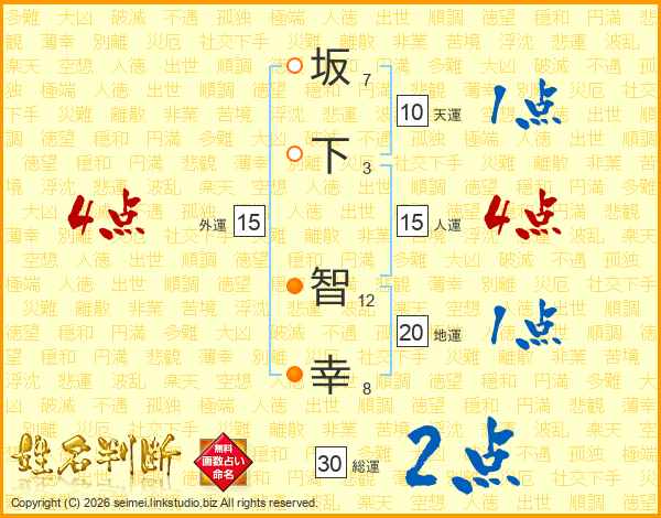 坂(7画)下(3画) 智(12画)幸(8画)