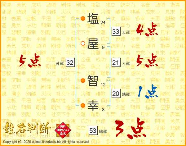 塩(24画)屋(9画) 智(12画)幸(8画)