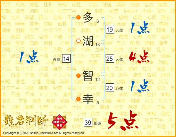 生活面を象徴する運勢です。外部から受ける影響力を表し、結婚運、家庭運や職場、環境への順応性を表します。総運から人運を引いた画数。姓や名が1文字の場合を除く。