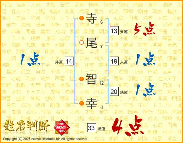 寺(6画)尾(7画) 智(12画)幸(8画)